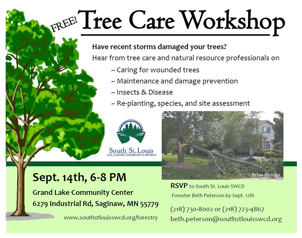 The south St. Louis Soil and Water Conservation district is hosting a workshop on tree care on Wednesday September 14th. We are hoping to provide information to people who had trees damaged in the storm that need care or replacement, or anyone interested in learning about how to improve the health of their trees. I was wondering if you would be willing to posting a notice of this on the Park Point Community Club web page. Park point is a unique place ecologically and I know many residents did see damage following the storms this July.